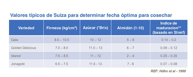 Cada país ha desarrollado su propio procedimiento estandarizado para determinar el momento idóneo para cosechar manzanas y peras. Se han elaborado varios índices, pero como hay considerables variaciones en los muchos parámetros de calidad de un año a otro, es importante tener experiencia práctica considerable para poder determinar la mejor fecha para cosechar.